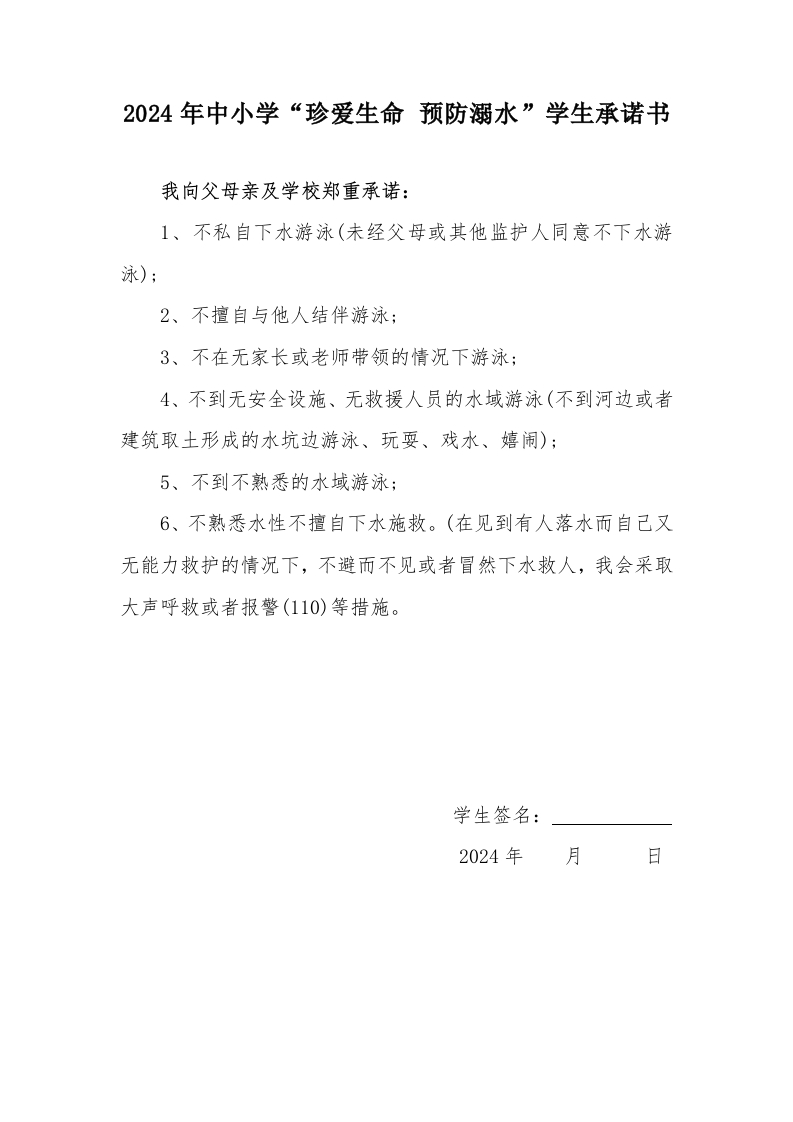 首页安全资料14.2024年中小学预防溺水学生承诺书