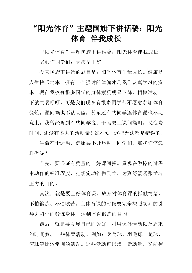 “阳光体育”主题国旗下讲话稿:阳光体育 伴我成长[推荐]