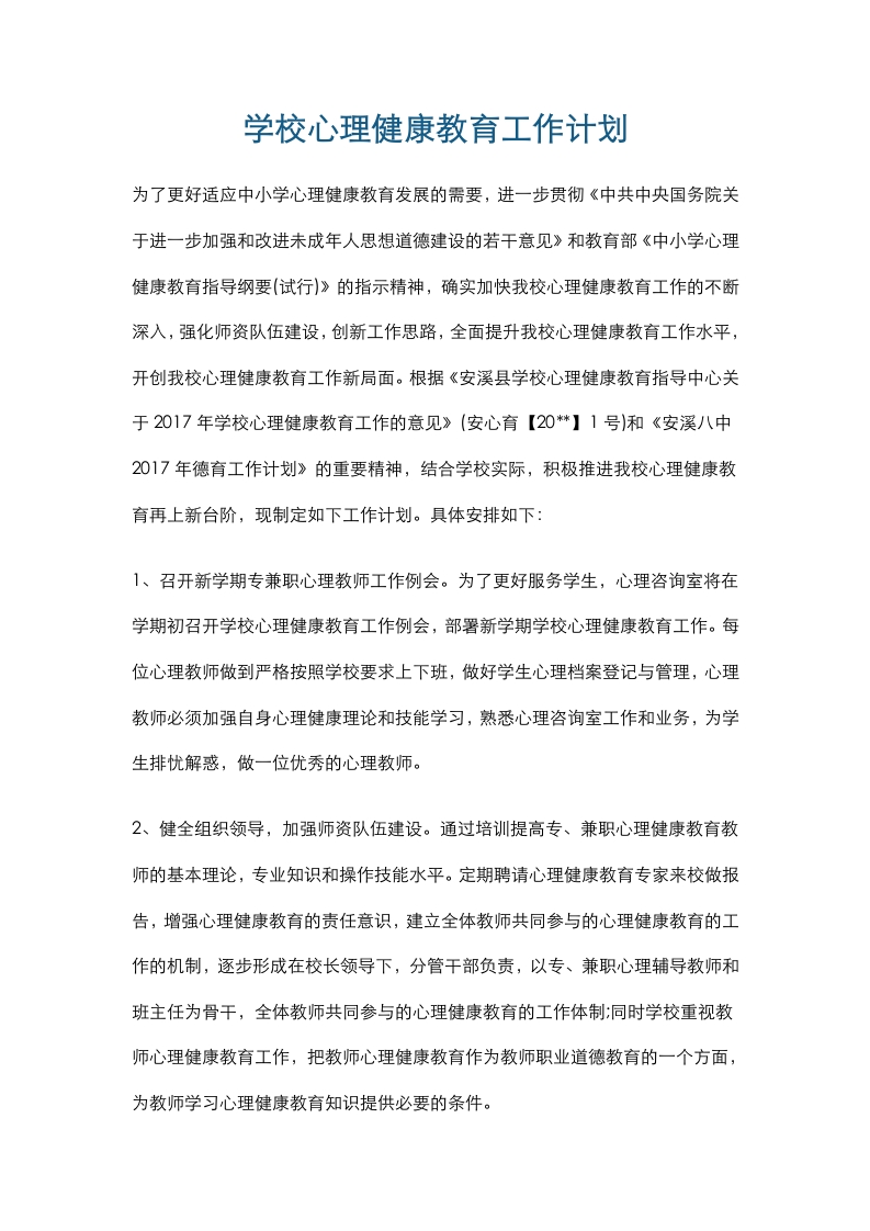 1.学校心理健康教育工作计划