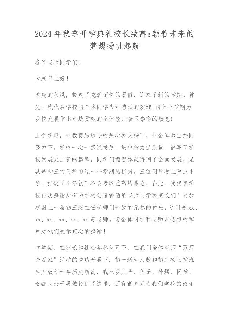 2024年秋季开学典礼校长致辞:朝着未来的梦想扬帆起航