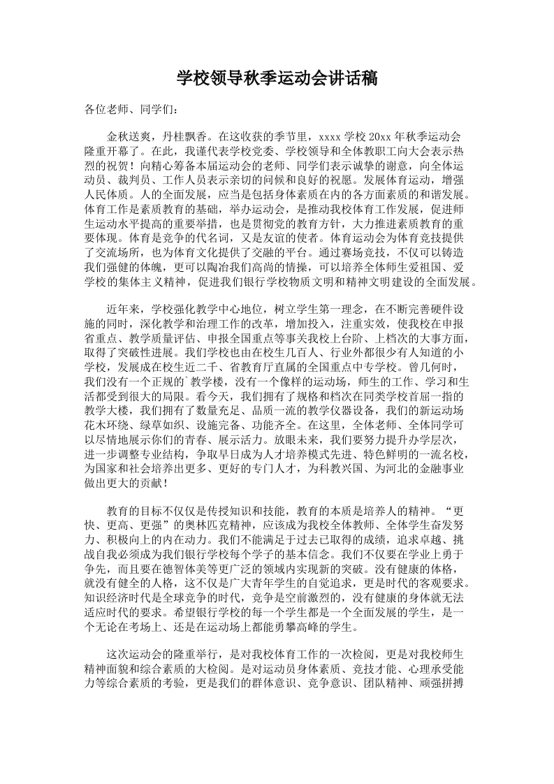 92.学校领导秋季运动会讲话稿