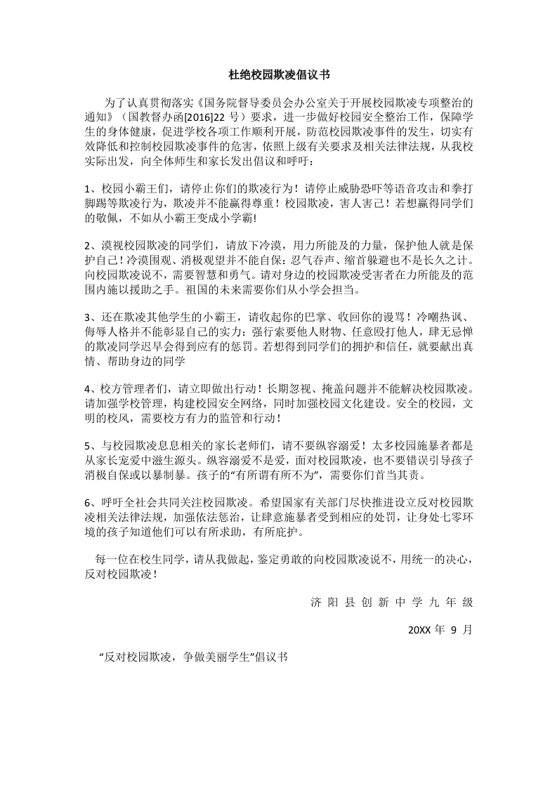 杜绝校园欺凌倡议书
