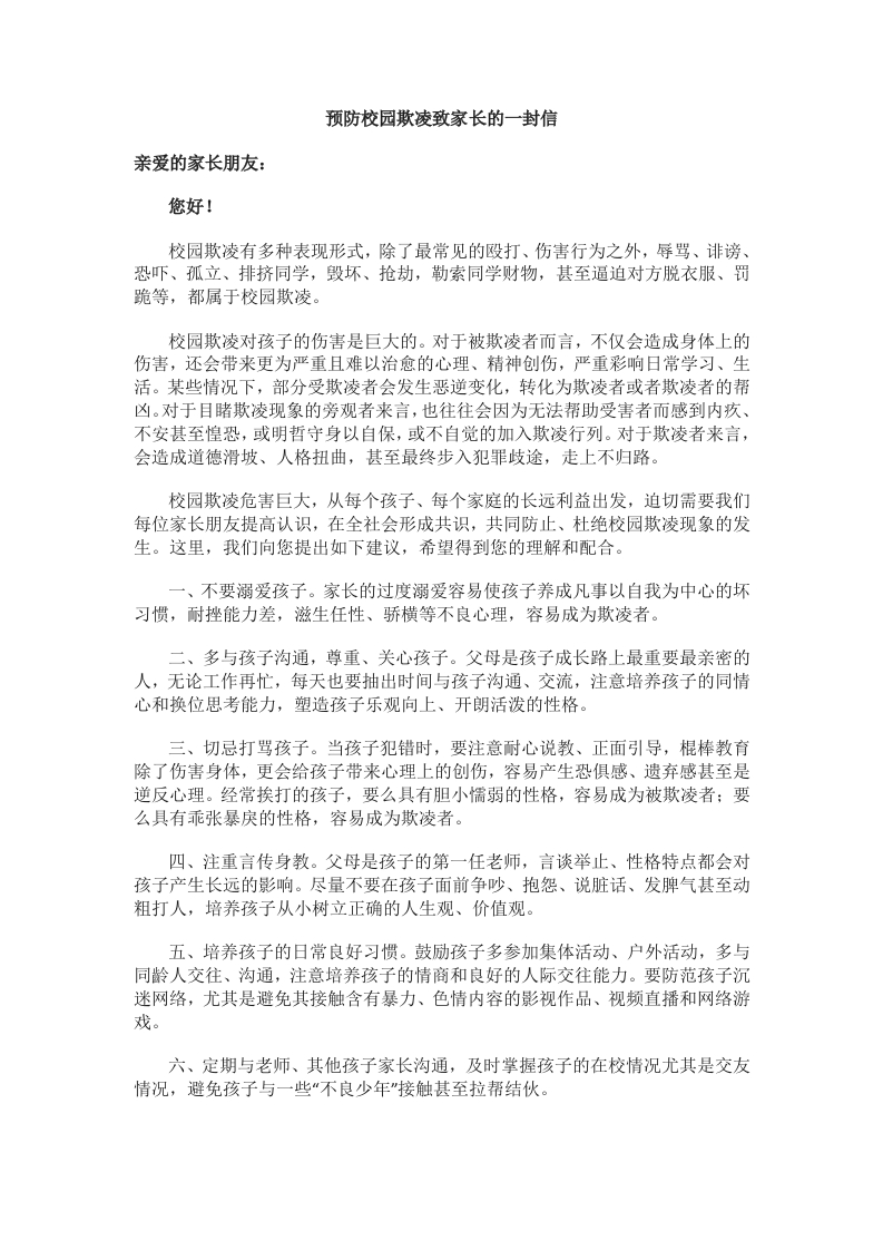 预防校园欺凌致家长的一封信