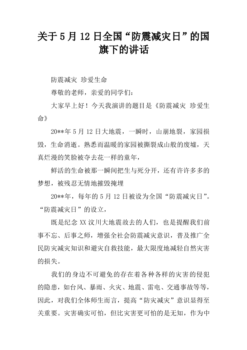 关于5月12日全国“防震减灾日”的国旗下的讲话[推荐]
