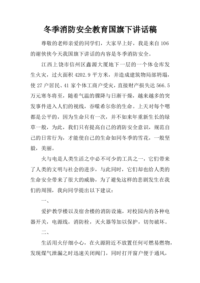 冬季消防安全教育国旗下讲话稿[推荐]
