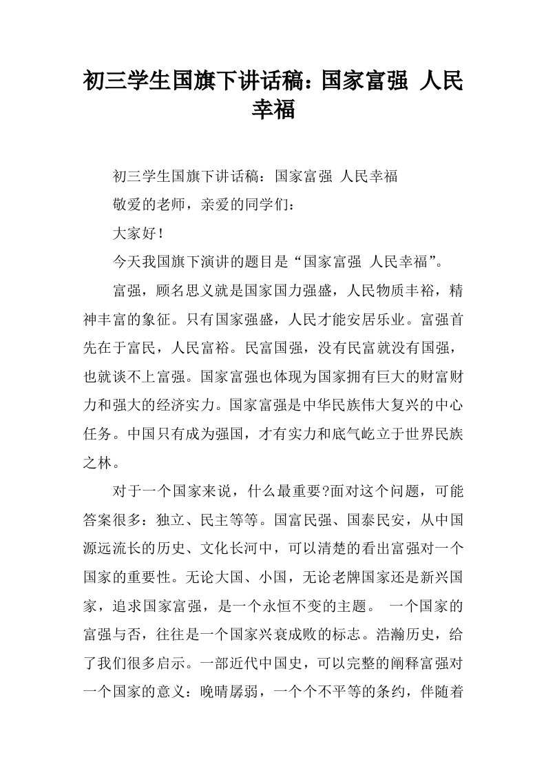 首页教研资料初三学生国旗下讲话稿:国家富强 人民幸福[推荐]