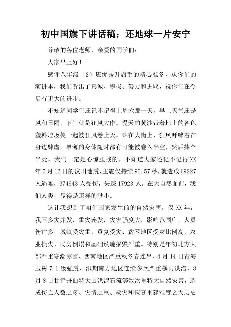 初中国旗下讲话稿:还地球一片安宁[推荐]