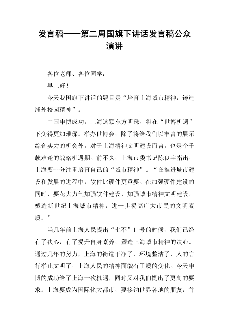 发言稿——第二周国旗下讲话发言稿公众演讲[推荐]