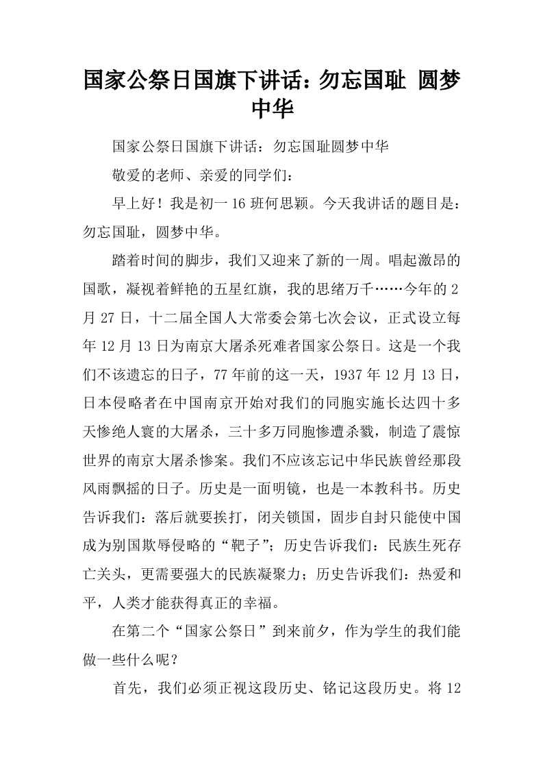 国家公祭日国旗下讲话:勿忘国耻 圆梦中华[推荐]