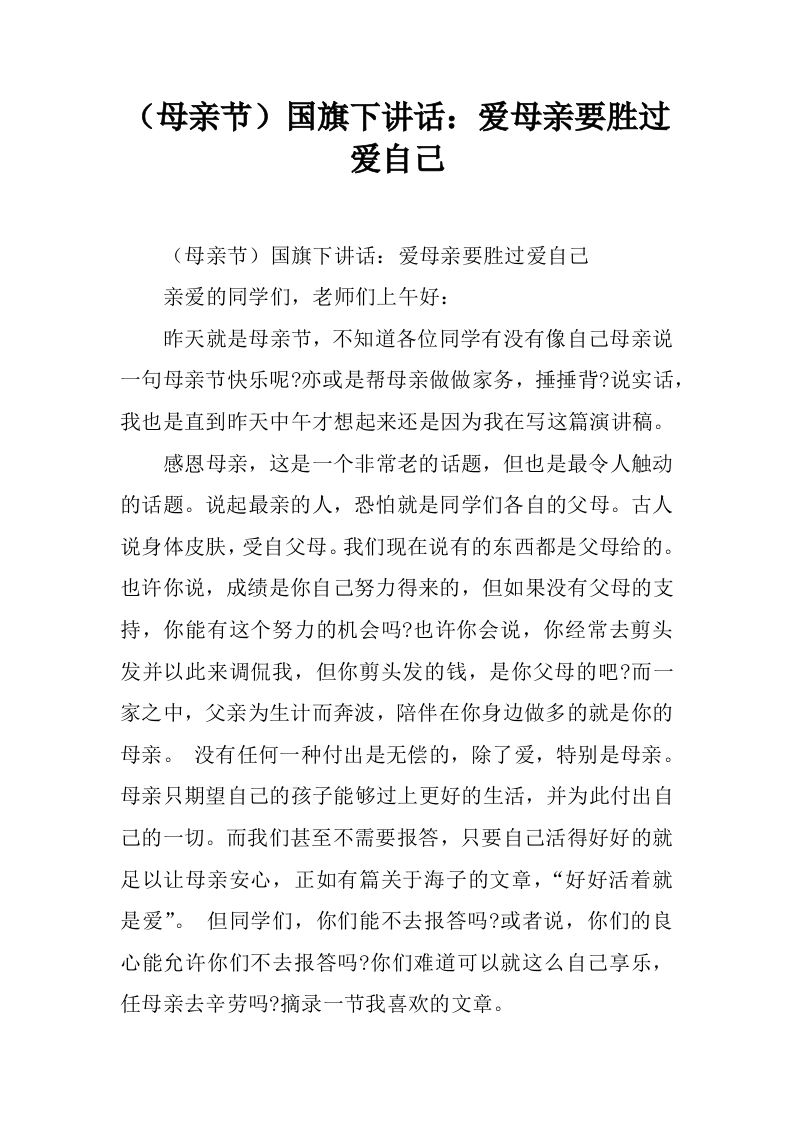 (母亲节)国旗下讲话:爱母亲要胜过爱自己[推荐]