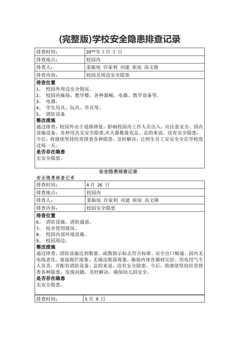 (完整版)学校安全隐患排查记录