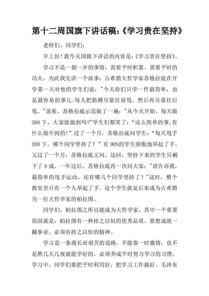 第十二周国旗下讲话稿:《学习贵在坚持》[推荐]
