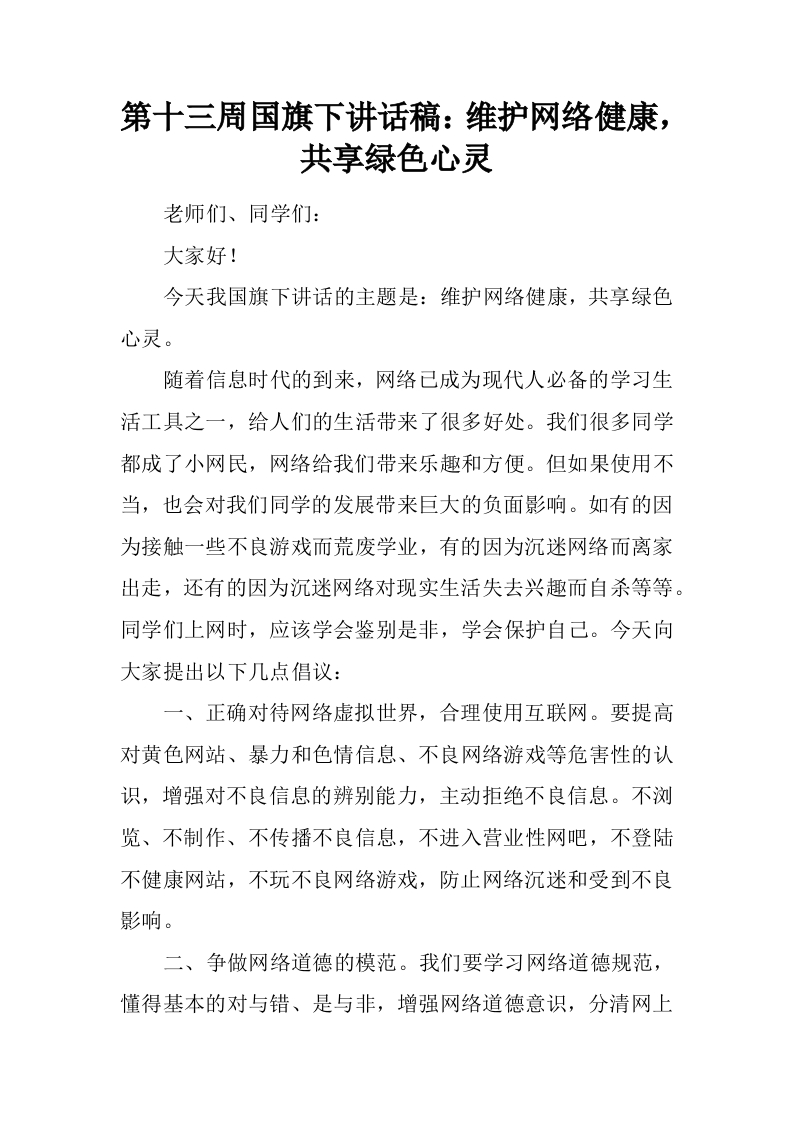 首页其他资料第十三周国旗下讲话稿:维护网络健康,共享绿色心灵[推荐]