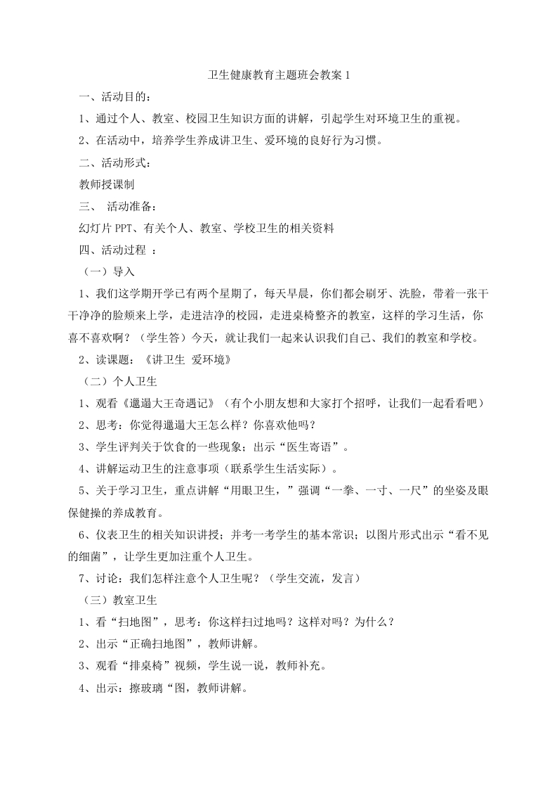 卫生健康教育主题班会教案