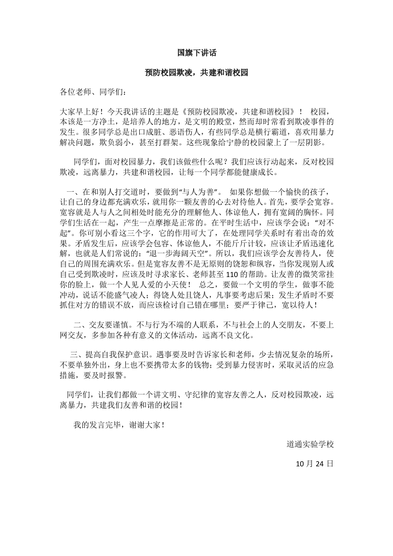 首页安全资料国旗下讲话 预防校园欺凌